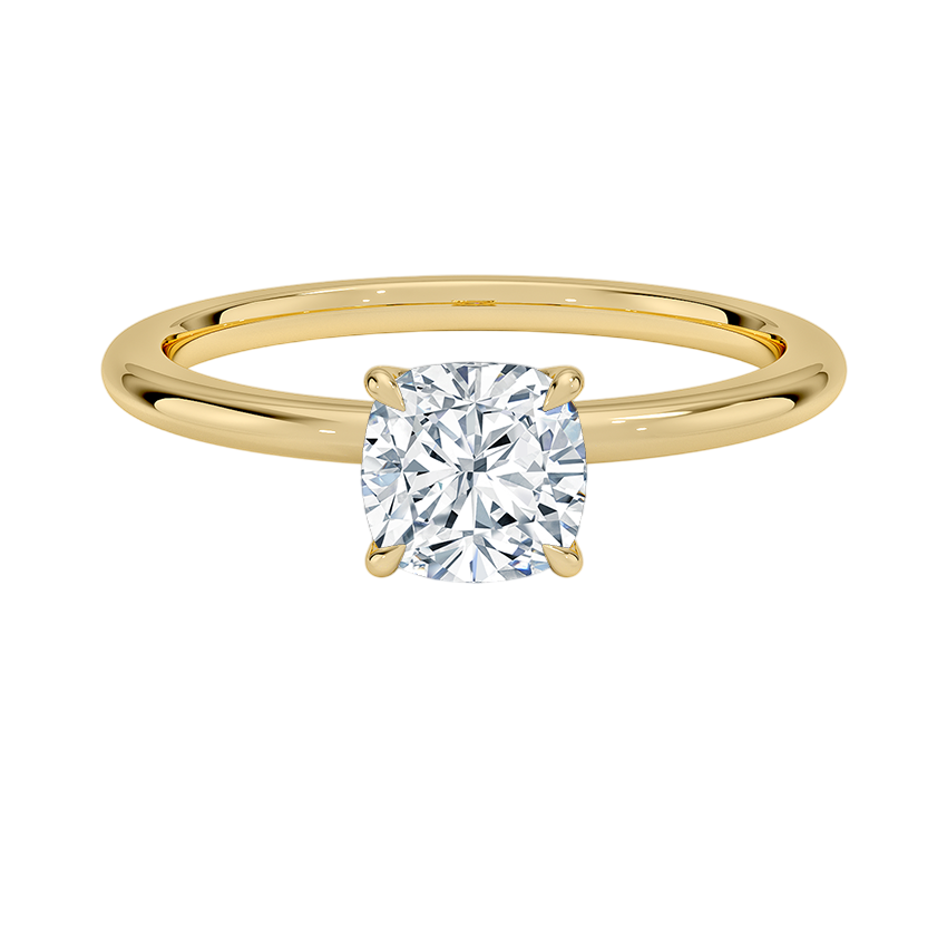 טבעת סוליטר משובצת יהלום בליטוש קושן, זמינה בזהב צהוב או לבן, החל מ-0.50 קראט.