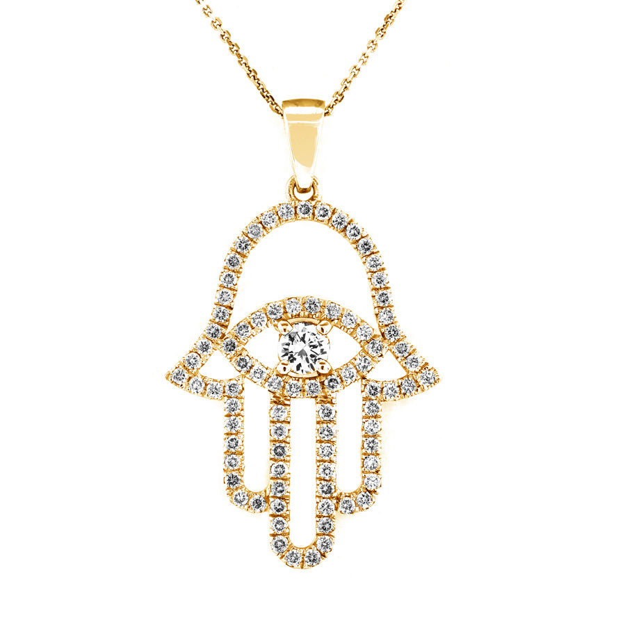 תליון חמסה 14K מגיע בזהב לבן ורוז, עם יהלומים טבעיים במשקל כולל של 1 קראט. תליון בעיצוב ייחודי, ומעוטר ביהלומים טבעיים בצדדים במשקל כ-0.75 קראט, אבן מרכזית כ-0.25 קראט.